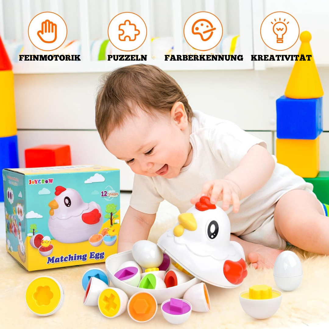 Dieses Montessori Lernspielzeug bietet 12 passende Eier, die ideal sind, um Farben und Formen zu lernen. Perfekt für die sensorische Entwicklung von Kleinkindern.